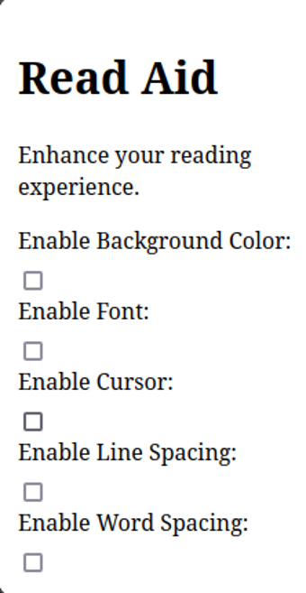 Reading Aid est un module complémentaire conçu pour personnaliser l'affichage des textes sur le navigateur Firefox. Il permet de modifier la couleur de fond, de changer la police de certains textes, et d'adapter le curseur en un rectangle, facilitant ainsi la lecture. Ce module offre aussi la possibilité d'ajouter de l'espace entre les mots et entre les lignes, ce qui peut être particulièrement bénéfique pour les utilisateurs souffrant de dyslexie ou d'ADHD.